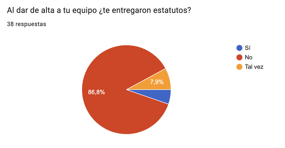 Un profesor o profesora en un territorio “n” da de alta ante el SIRED a sus chicos y chicas, a su equipo pues; ¿qué sucede después? El presidente no se comunica, ni le da la bienvenida, ni nada… el 86.8% de los encuestados desconoce los estatutos, frente a un 7.9% que tal vez si.