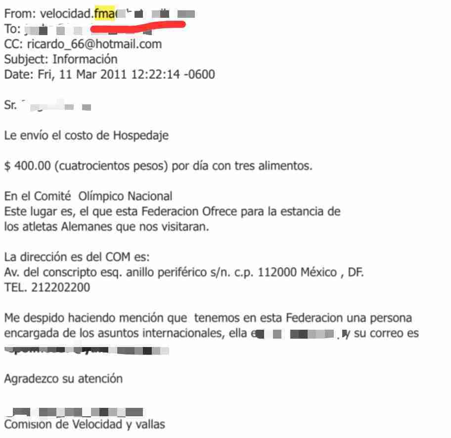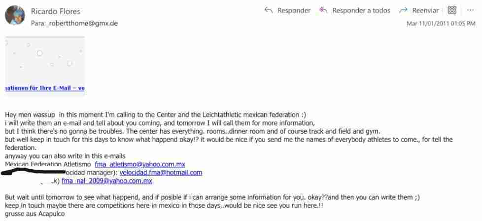 Correo electrónico de mi excompañero de equipo de Alemania Robert Thome: En el que preguntaba si habría posibilidad de entrenar en México con fecha de l 12 de Abril al 2 de Mayo del 2011 y que otras personas llegarían en otras fechas. Pidiendo ayuda para generar todo el tema de gestión. Precisaban información que en su momento yo no tenía, puesto que me encontraba concentrado en el entrenamiento rumbo a Juegos Panamericanos del mismo año y que se suponía que los encargados lo harían…3