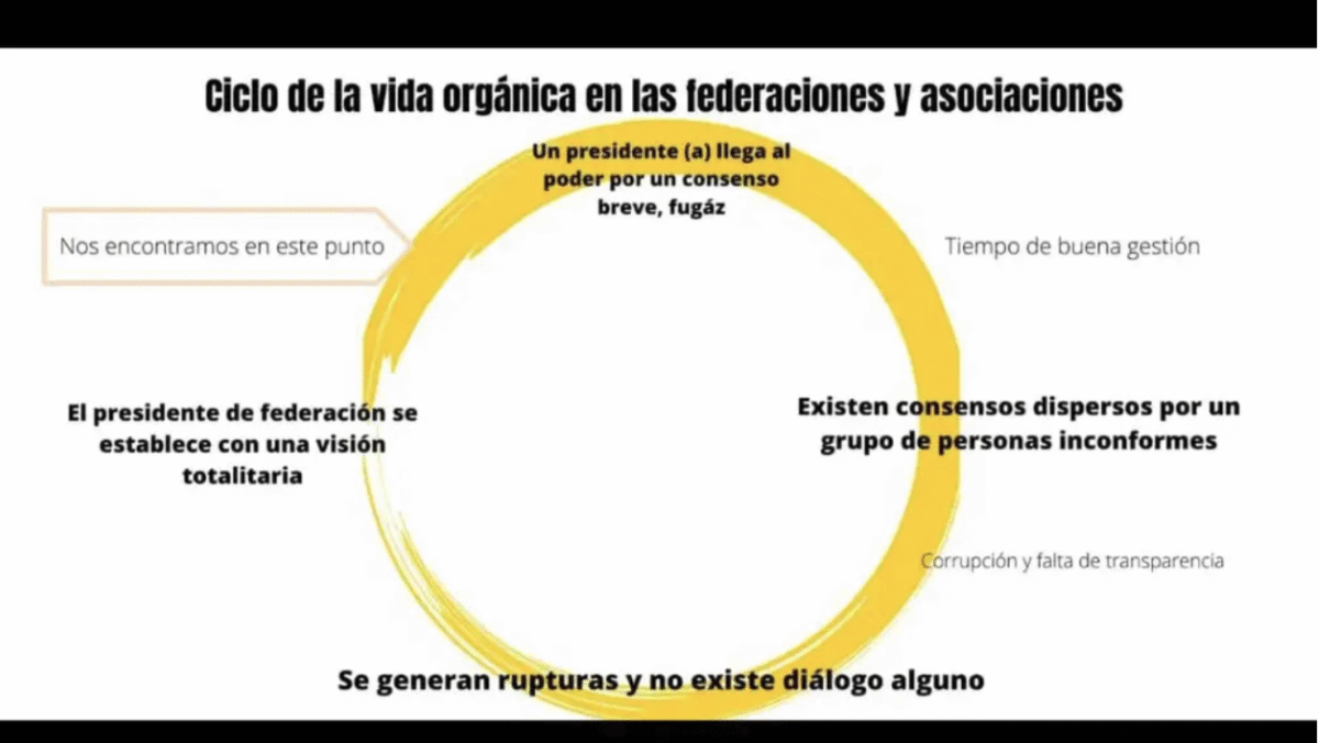 • Poca comunicación (ida y vuelta) en los problemas que nos competen entre el gremio ( No generar asambleas para elegir a nuestr@ presidente de asociación y por ende al presidente(a) de Federación), presidencias, y sobre todo atletas, ni comunicar las acciones a una mayoría presente.